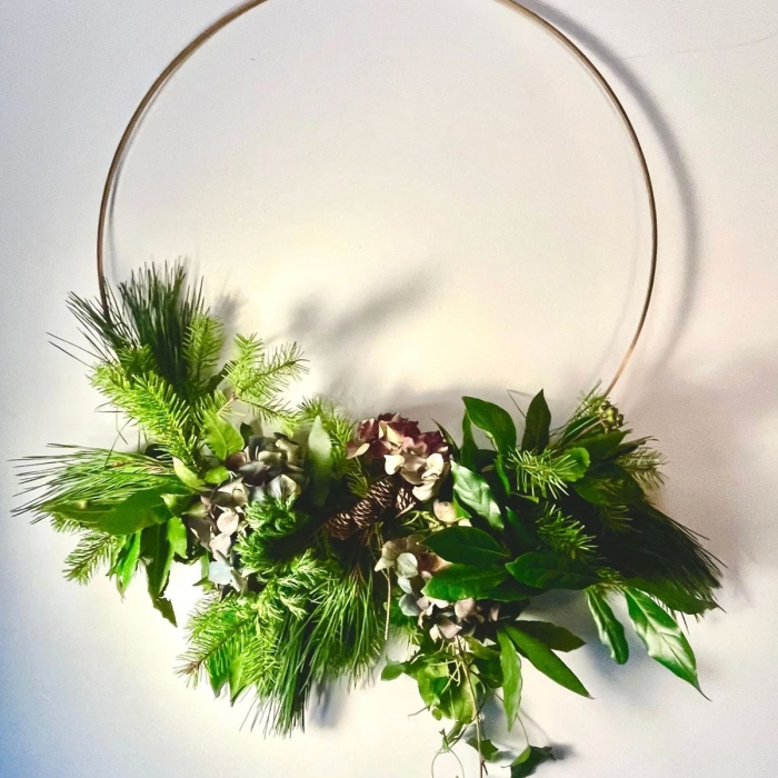 The Seasonal Wreath Making Workshops, use locally gathered greenery, foraged textures, and dried natural materials sourced right here in East Cork on our distinctive brass hoop.